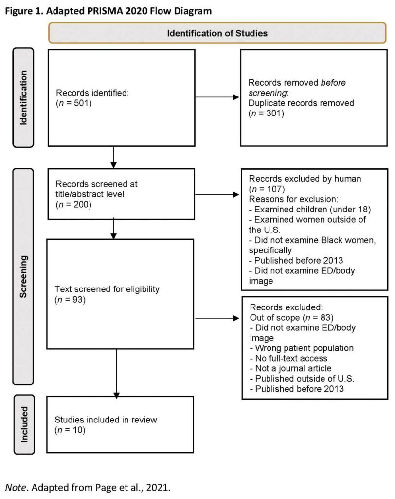 This review outlines research spanning a 12-year timeframe, providing a bridge to the anchor article written by Harris (2015). Because of reasons outside of our control, there were a handful of articles that were inaccessible. Furthermore, because of these constraints, we did not conduct reference mining as part of the search strategy. These articles may have added to the findings of the present study. We utilized Covidence software to review articles and lessen the chance of reviewer bias. After consensus was reached between Chilson and Mecadon-Mann, Gwira and Rosario-Singer provided insight into the articles and cultural implications of the research. However, bias is still a possibility in identifying terms and phrases that allude to body image satisfaction or dissatisfaction. An additional limitation is that this review only examined cisgender women. Research examining body image ideals and eating disorder prevalence in individuals outside of the gender binary is needed. The most substantial limitation is the dearth of research specifically focused on body image and EDs in Black women. Therefore, the authors identified a need for ED research and practice publications specifically focused on treating Black women in the United States.